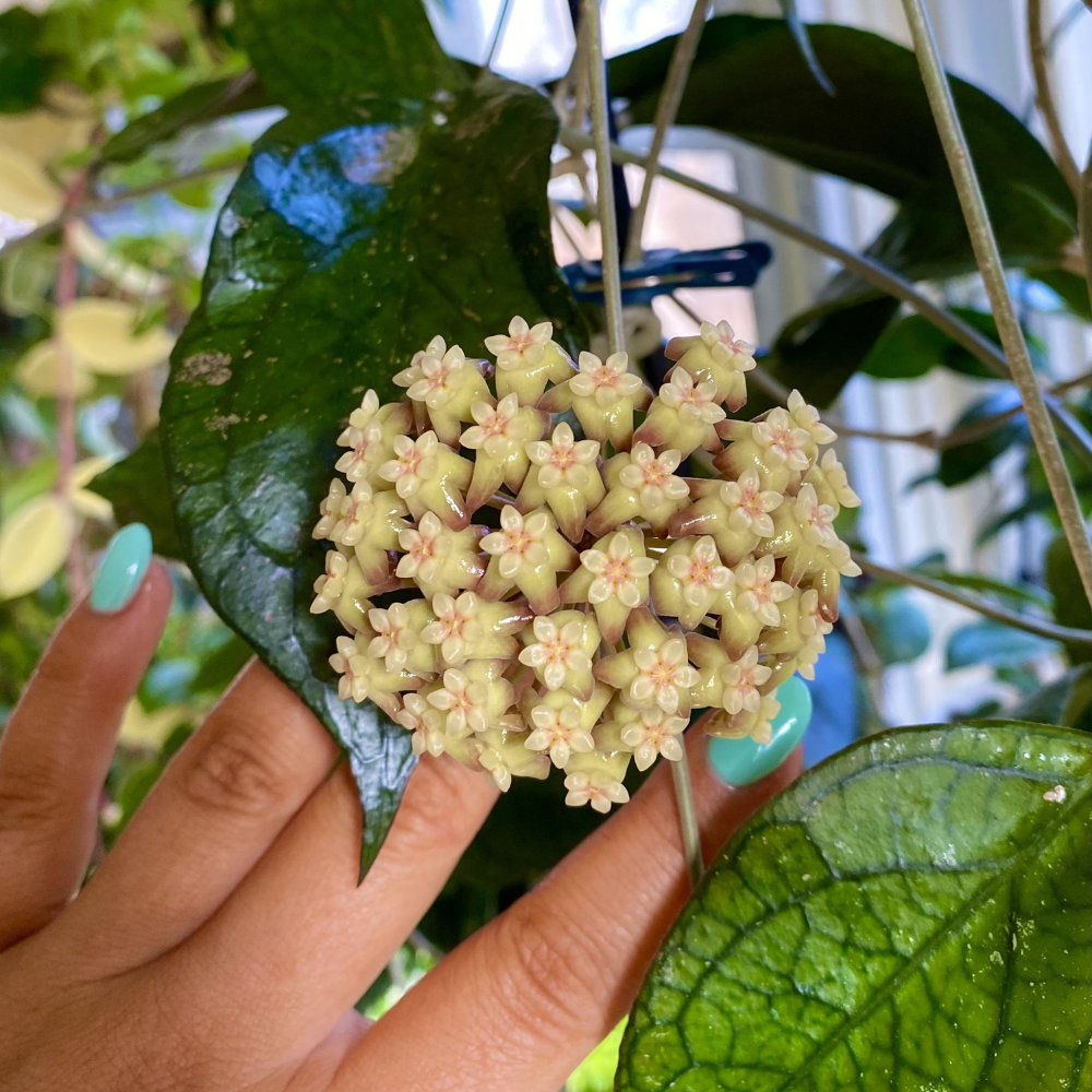 True to its Hoya heritage, ‘Tequila Sunrise’ produces flowers in the characteristic umbel formation — rounded clusters of small, waxy, star-shaped blooms. The flowers are typically white to pale pink with a contrasting corona (staminal crown) at the centre, and they emit a sweet, subtle fragrance that intensifies during evening hours when the nectar production peaks to attract nocturnal pollinators. Each umbel contains 15 to 25 individual flowers, creating an elegant natural bouquet effect.