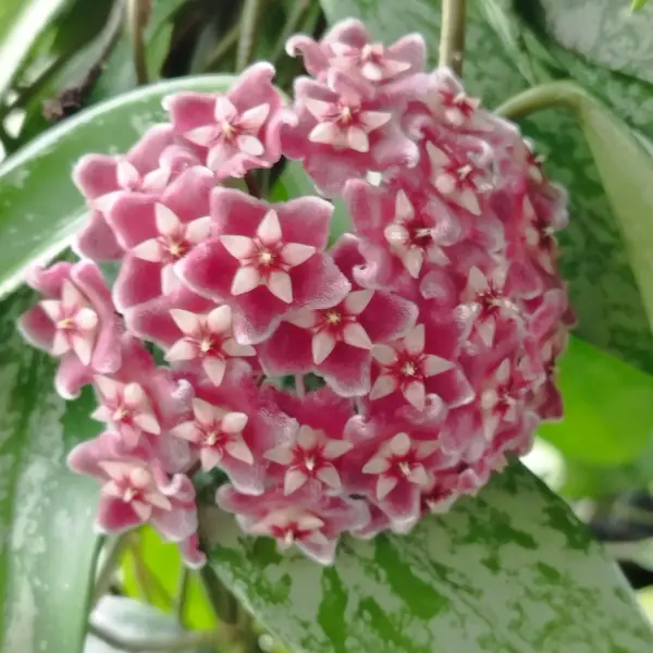 💚 Hoya pubicalyx 'Silver Spot' (Reva) combină un frunziș spectaculos „splash” cu flori intens parfumate, fiind o alegere sigură pentru colecțiile de hoya viguroase și ușor de crescut.