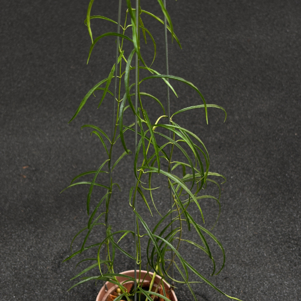Frunzele sunt subțiri, lanceolate, cu o textură fină și o nuanță verde intensă. Planta crește ca o specie agățătoare grațioasă, dezvoltând tije lungi și flexibile care arată spectaculos în ghivece suspendate.